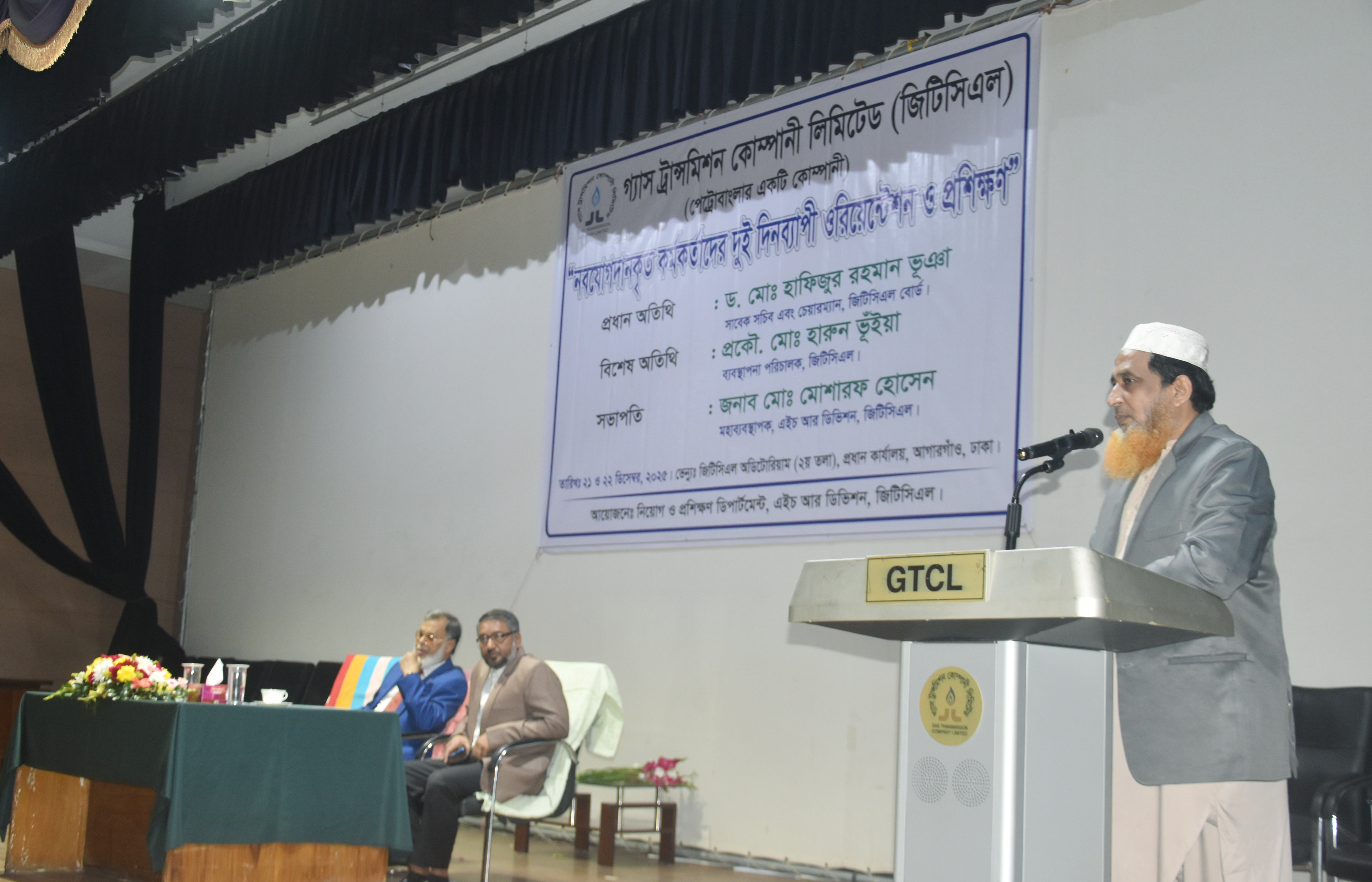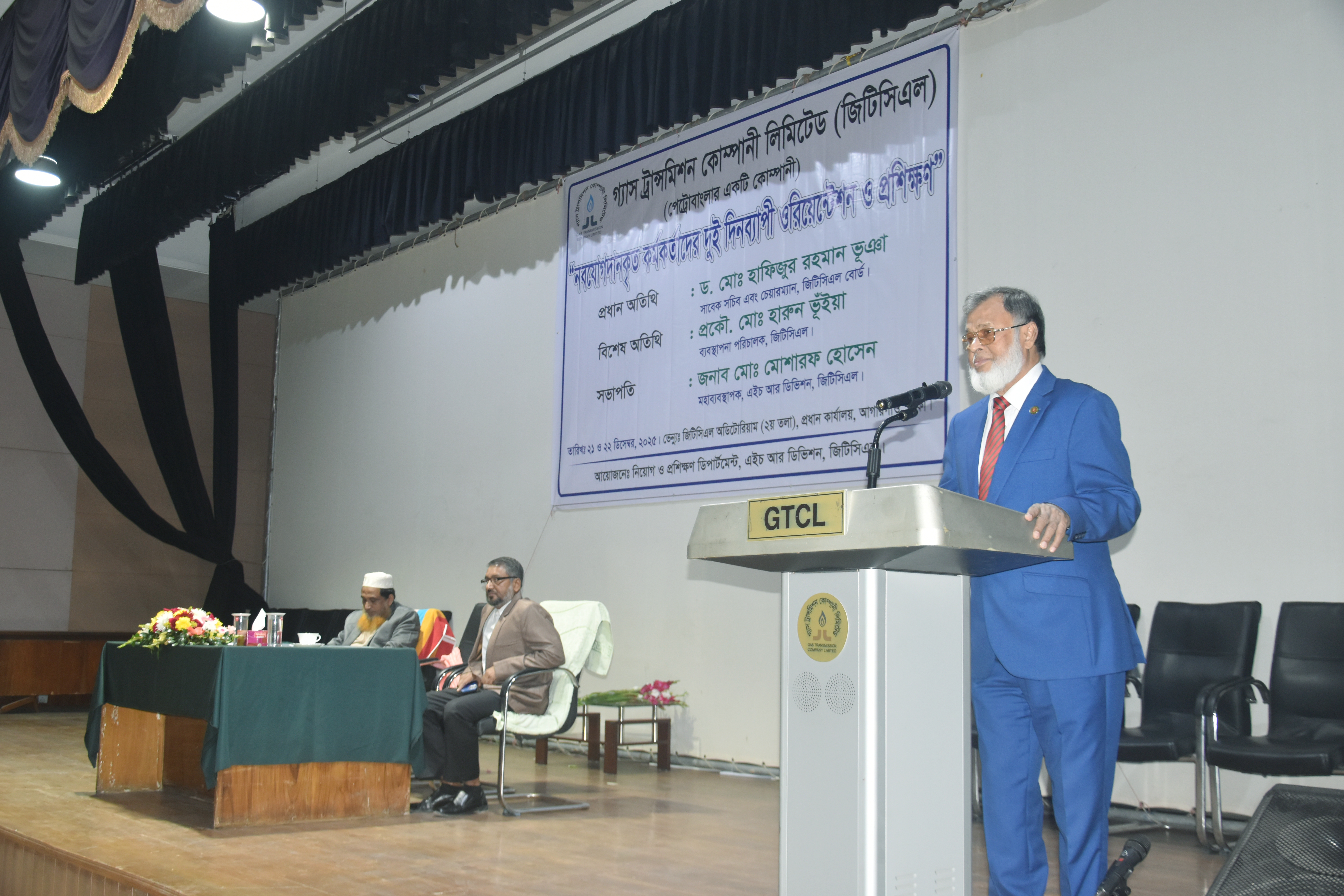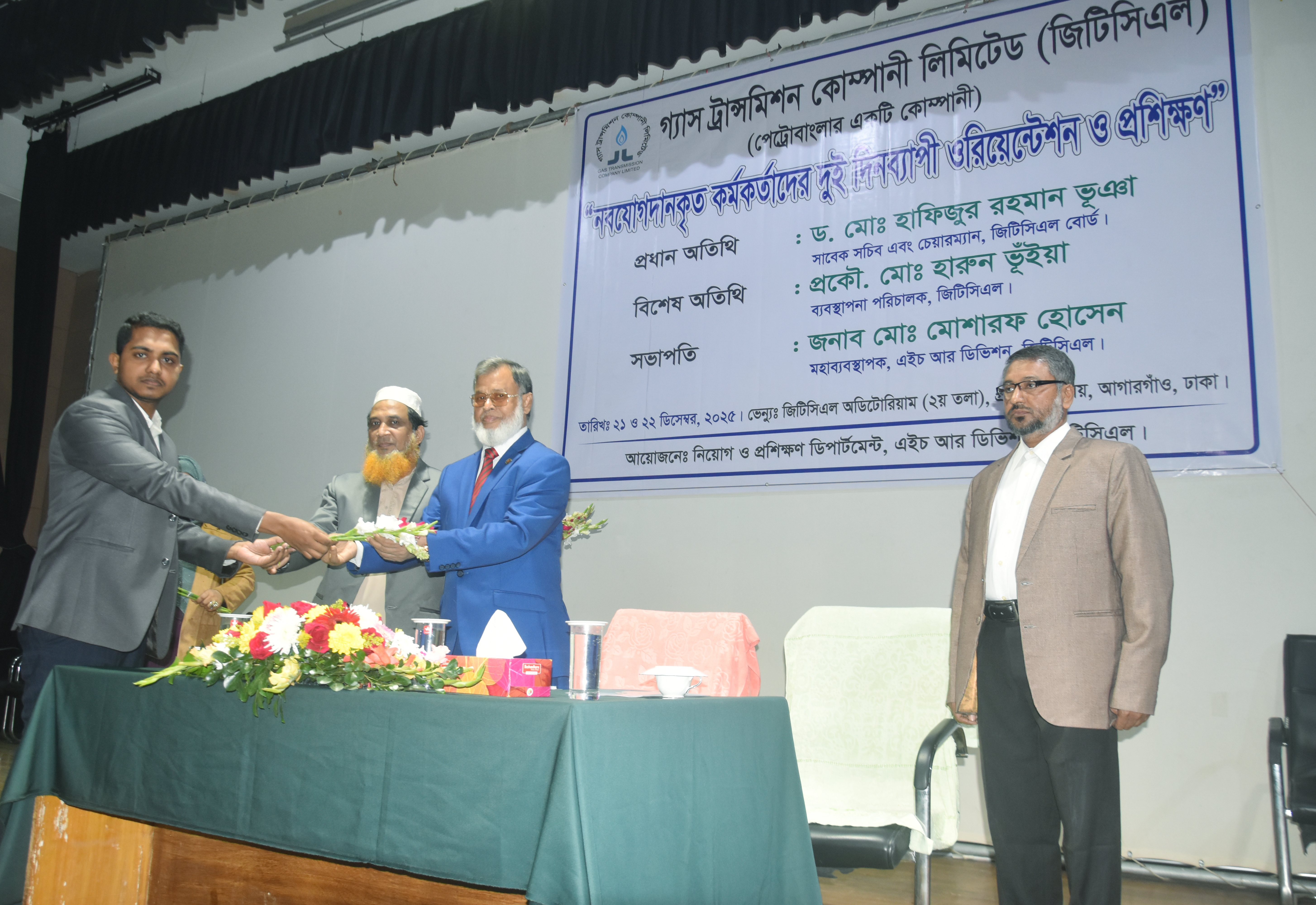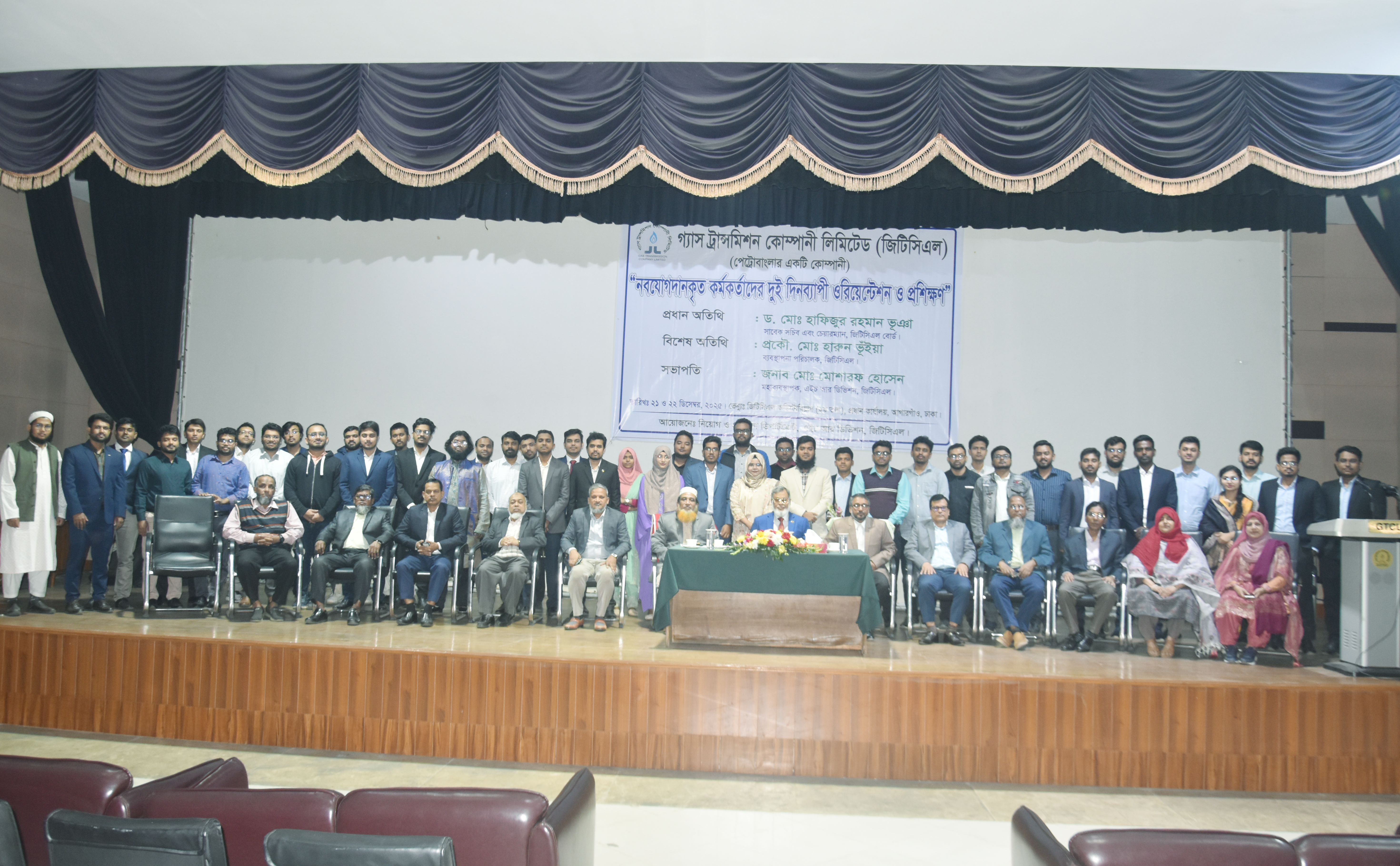 গ্যাস ট্রান্সমিশন কোম্পানী লিমিটেড-এ ৯ম ও ১০ম গ্রেডে নব যোগদানকৃত কর্মকর্তাগণের দুই দিনব্যাপী ওরিয়েন্টেশন ও প্রশিক্ষণ কর্মসূচি ২১ ডিসেম্বর ২০২৫ তারিখ কোম্পানির প্রধান কার্যালয়স্থ অডিটোরিয়ামে অনুষ্ঠিত হয়। উক্ত ওরিয়েন্টেশন অনুষ্ঠানে প্রধান অতিথি হিসাবে ড. মো: হাফিজুর রহমান ভূঞা, চেয়ারম্যান, জিটিসিএল পরিচালক পর্ষদ এবং বিশেষ অতিথি হিসাবে কোম্পানির ব্যবস্থাপনা পরিচালক প্রকৌ. মো: হারুন ভূঁইয়া উপস্থিত ছিলেন। অনু্ষ্ঠানে সভাপতিত্ব করেন জনাব মো: মোশারফ হোসেন, মহাব্যবস্থাপক, এইচ আর। বোর্ড চেয়ারম্যান ও ব্যবস্থাপনা পরিচালক মহোদয় অনুষ্ঠানের শুরুতে নবাগত কর্মকর্তাবৃন্দকে ফুল দিয়ে স্বাগত জানান। অনুষ্ঠানে প্রধান অতিথি নতুন নিয়োগপ্রাপ্ত কর্মকর্তাবৃন্দকে কর্মক্ষেত্রে উৎসাহ প্রদানসহ চাকুরীর দায়-দায়িত্ব/করণীয় সম্পর্কে দিক-নির্দেশনামূলক বক্তব্য প্রদান করেন। তিনি নবনিযুক্ত কর্মকর্তাবৃন্দকে দক্ষ ও যোগ্য কর্মকর্তা হিসেবে গড়ে তুলতে নিজেদের সক্ষমতা বৃদ্ধি এবং সার্বক্ষণিক আপডেট থাকার বিষয়ে গুরুত্বারোপ করেন। এছাড়া কোম্পানির ব্যবস্থাপনা পরিচালক মহোদয় নতুন কর্মকর্তাবৃন্দকে দায়িত্বশীল হয়ে কাজ করার এবং তাদেরকে কাজে উদ্বুদ্ধ করার লক্ষ্যে অনুপ্রেরণামূলক বক্তব্য প্রদান করেন। পরবর্তীতে কোম্পানির মহাব্যবস্থাপকবৃন্দ স্ব স্ব ডিভিশন সংশ্লিষ্ট Ges কোম্পানির সার্বিক কর্মকান্ডের ওপর সংক্ষিপ্ত বক্তব্য প্রদান করেন।