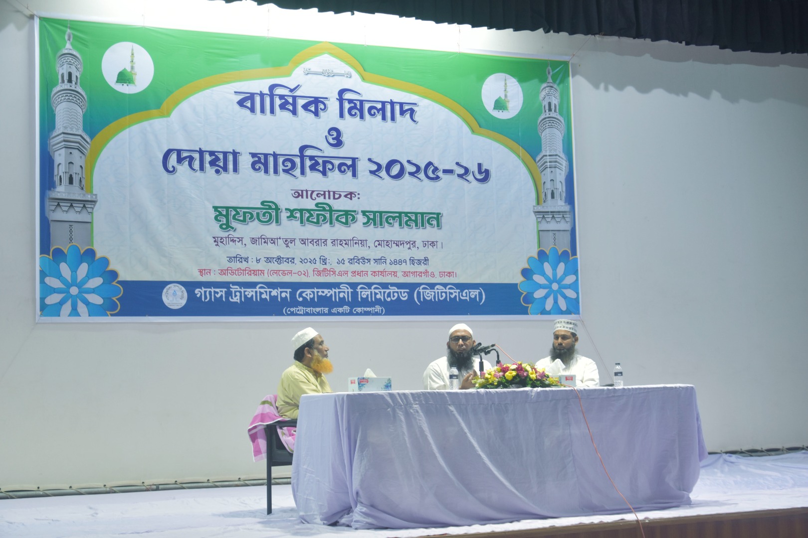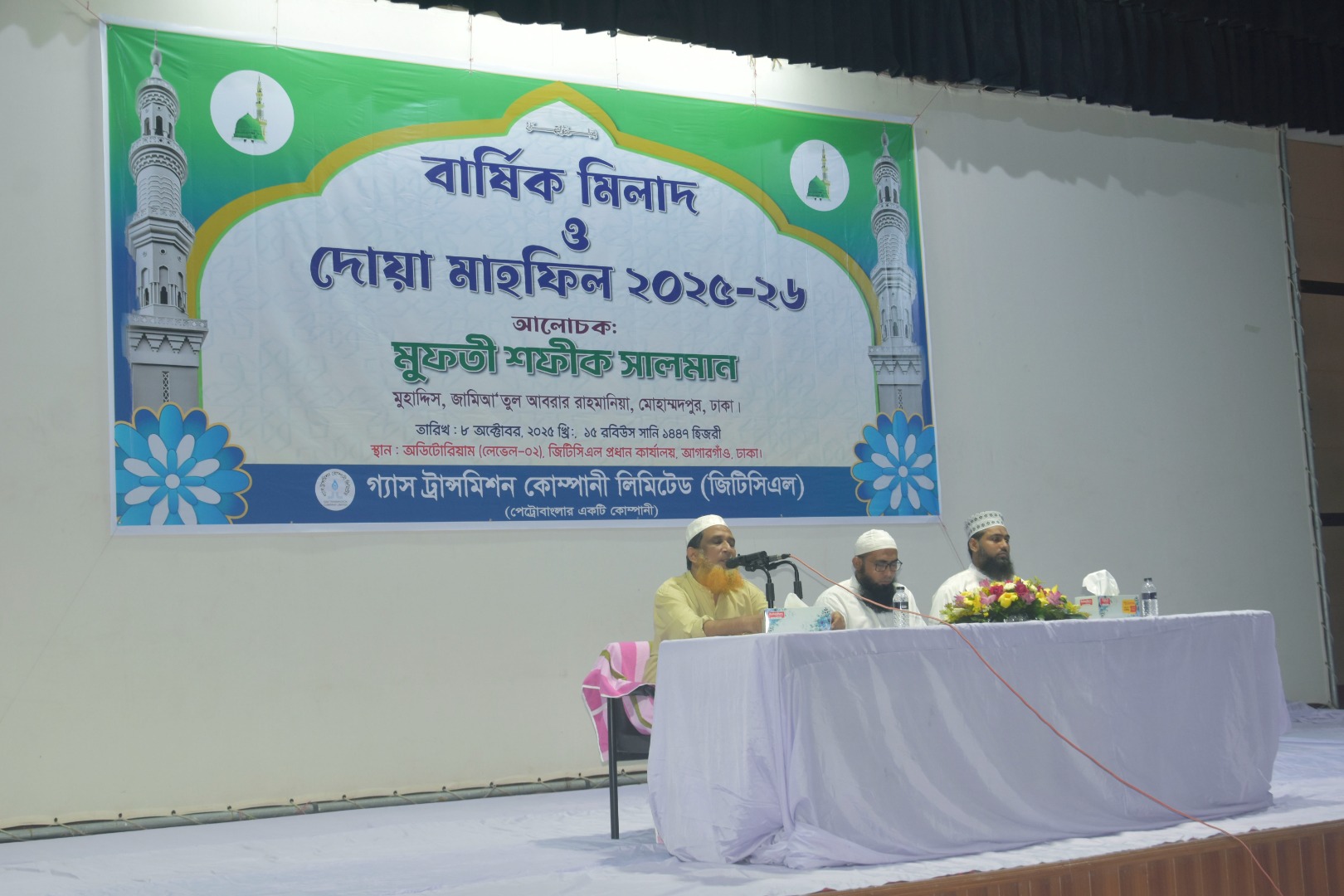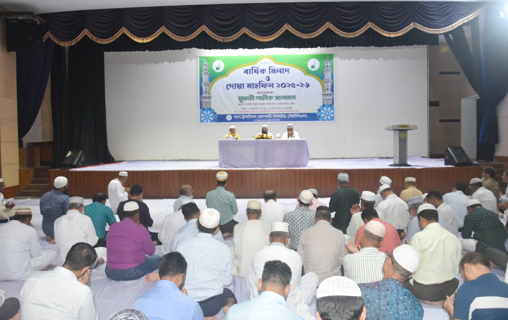 গ্যাস ট্রান্সমিশন কোম্পানি লিমিটেড এর ২০২৫-২০২৬ অর্থ বছরের ‘বার্ষিক মিলাদ ও দোয়া মাহফিল’ ০৮ অক্টোবর ২০২৫ ইং, ১৫ রবিউস সানি, ১৪৪৭ হিজরী, রোজ বুধবার বেলা ২:৩০ ঘটিকায় জিটিসিএল প্রধান কার্যালয়স্থ অডিটোরিয়ামে অনুষ্ঠিত হয়। উক্ত অনুষ্ঠানে কোম্পানির ব্যবস্থাপনা পরিচালক প্রকৌ. মো: হারুন ভূঁইয়া প্রধান অতিথি এবং মুফতী জনাব শফীক সালমান, মুহাদ্দিস, জামিআ’তুল আবরার রাহমানিয়া, মোহাম্মদপুর, ঢাকা প্রধান আলোচক হিসেবে উপস্থিত ছিলেন। কোম্পানির সকলস্তরের কর্মকর্তা ও কর্মচারীবৃন্দ (পিআরএল ভোগরত এবং অবসরপ্রাপ্ত কর্মকর্তা ও কর্মচারীবৃন্দসহ) উক্ত মিলাদ মাহফিলে অংশগ্রহণ করেন। উক্ত মিলাদ ও দোয়া মাহফিলে জিটিসিএল এর পরলোকগত কর্মকর্তা ও কর্মচারীদের রুহের মাগফিরাত কামনা করা হয়। এছাড়া কর্মরত কর্মকর্তা এবং কর্মচারীদের শারীরিক সুস্থতা এবং জিটিসিএল এর উত্তরোত্তর সাফল্য ও মঙ্গল কামনা করে মহান আল্লাহ্ তা’আলার নিকট দোয়া প্রার্থনা করা হয়।